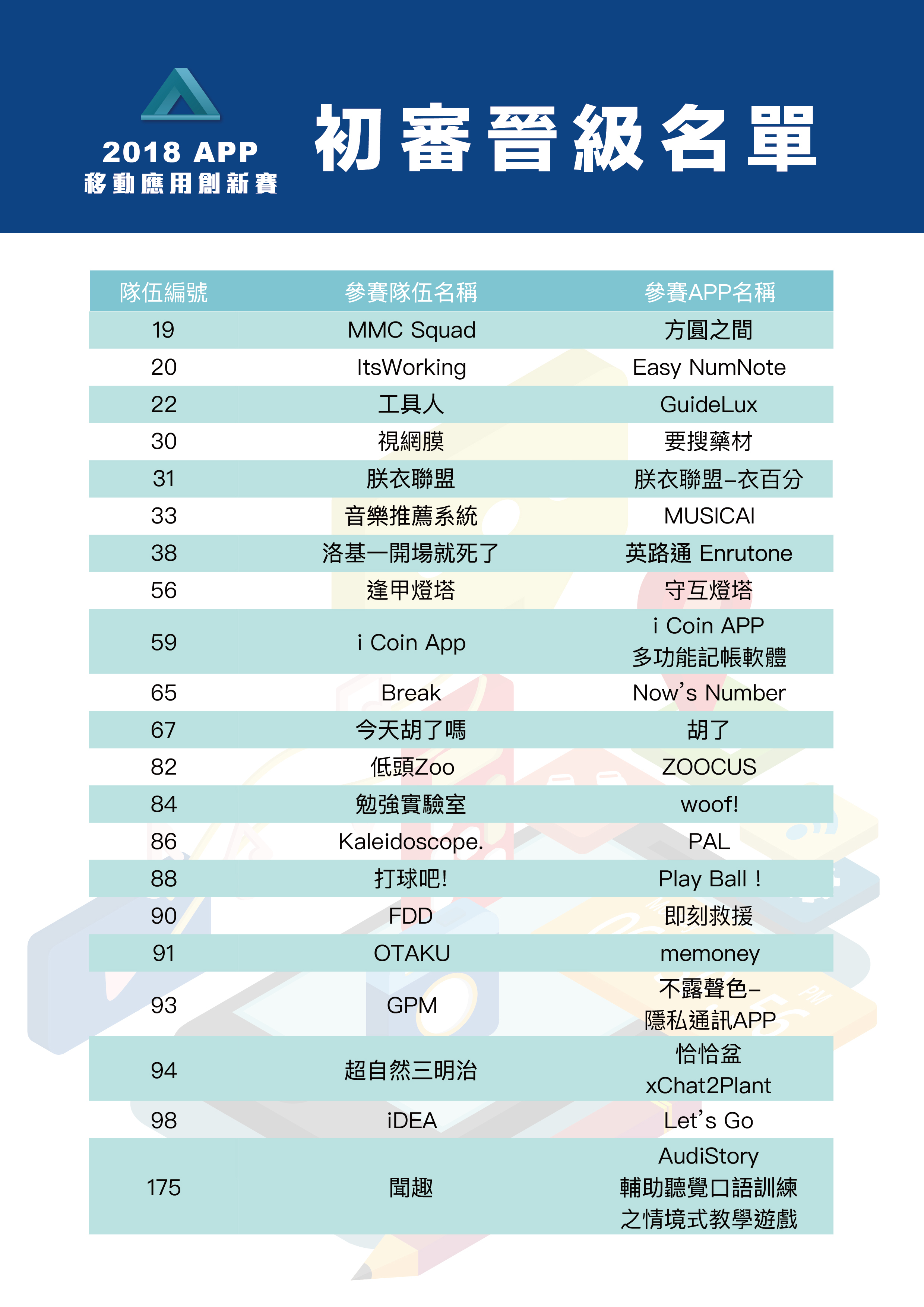 「APP移動應用創新賽」4 月起開放資訊相關與跨領域大專院校 、研究所、博士等具在學身份學生自組團隊開發 APP,吸引來自 34 所學校、176 組隊伍參加件作品參賽,競爭相當激烈,初審共邀請 9 位大專院校教授與業界專業人士擔任評審,針對APP作品企劃書進行書面初審,依創新設計 40 分、前景評估 30 分和企劃書資料完整性 30 分,共計 100 分作為標準,秉持著公平公正的原則,選出 21 隊初賽優秀隊伍。