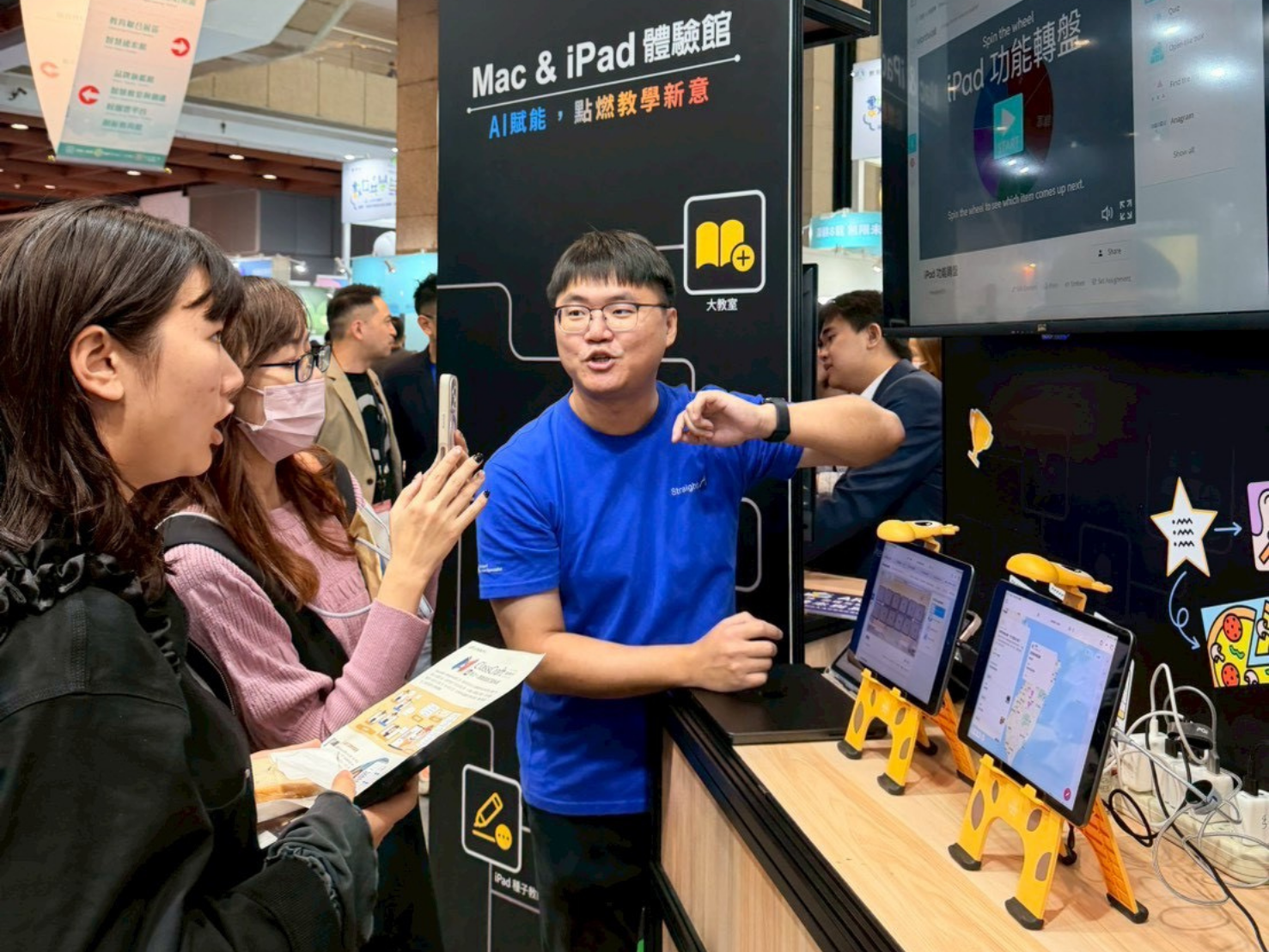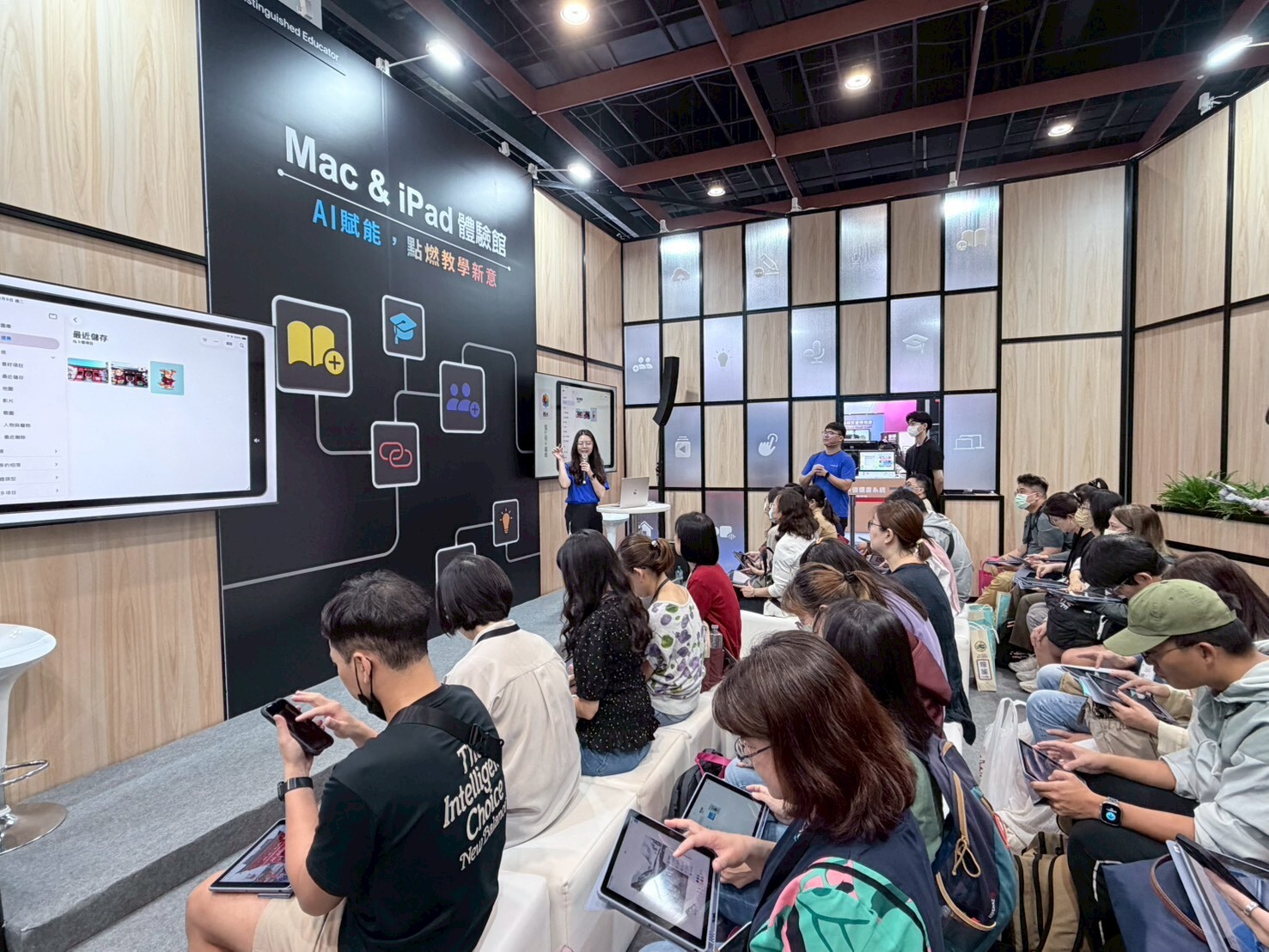 展區示範 iPad 軟體的教學應用,吸引師生聚集觀賞。