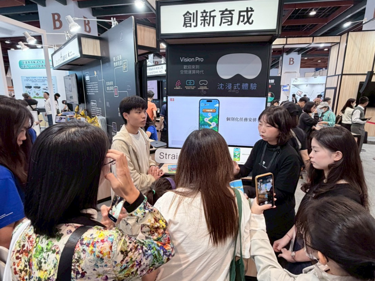 學生在『教育科技展』攤位體驗 ARpedia 教學內容,現場互動熱絡。