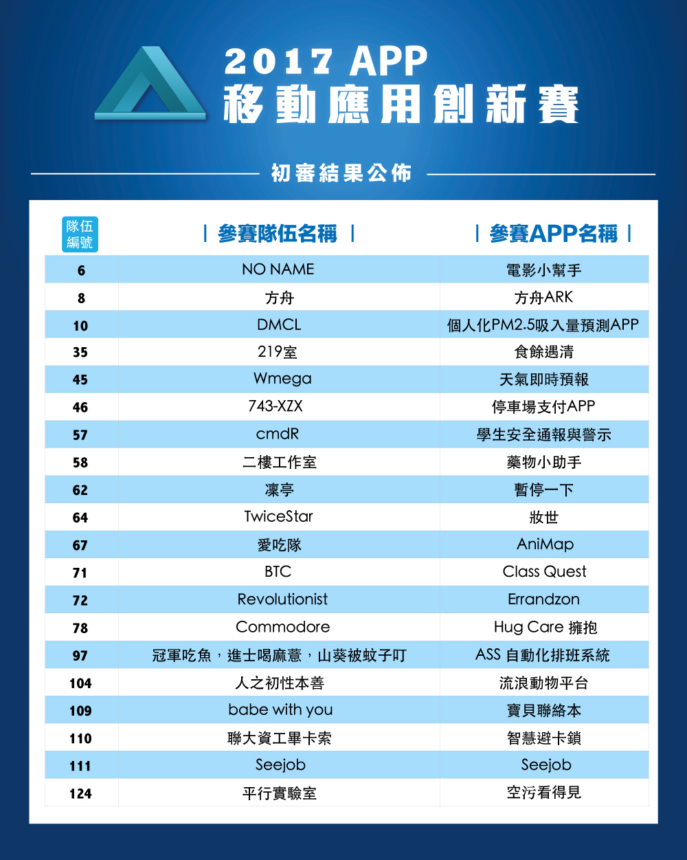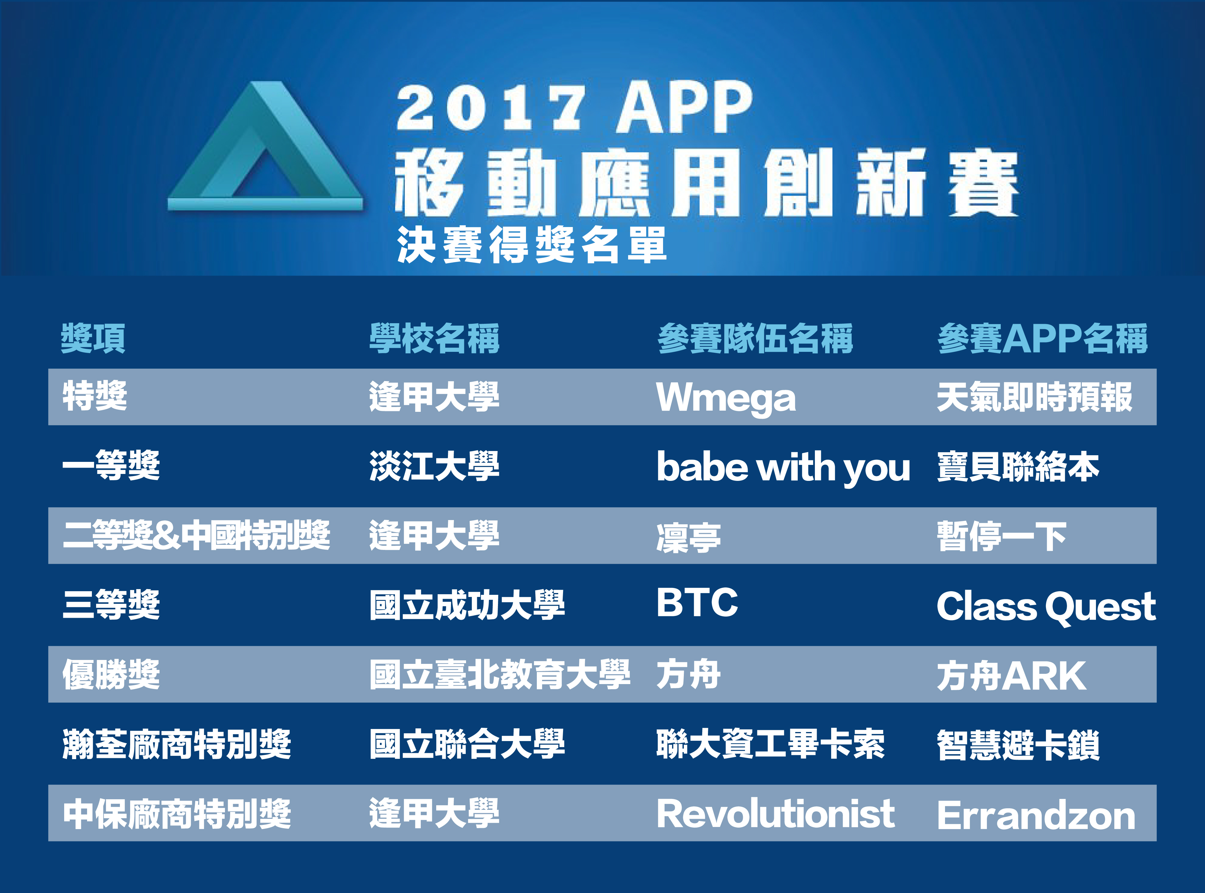 歷經4個月,於110組報名作品中,初選出12間學校、共計20隊優秀隊伍,於台灣總決賽選出前五名隊伍,經過一整天的展演與激烈決選後,最後冠軍由逢甲大學學生所開發的《天氣即時預報》APP拔得頭籌贏得特獎、一獎為淡江大學學生開發的《寶貝聯絡本》APP、二獎為逢甲大學學生開發的《暫停一下》APP、三獎為成功大學學生開發的《Class Quest》APP、佳作為台北教育大學學生開發的《方舟》APP,五隊得獎團隊將代表台灣參加大中華區「2017年APP移動應用創新賽」總決賽。