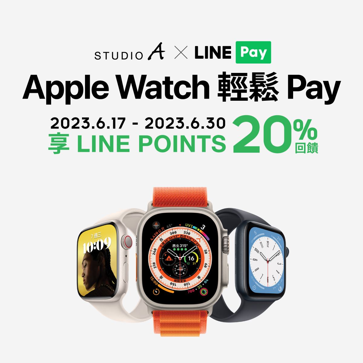⁃ 回饋以購買Apple Watch實際付款的金額計算,供貨情形依STUDIO A/Straight A網站顯示或現場公告為準,同筆交易內的非指定商品、配件、使用一卡通MONEY帳戶付款、全額使用LINE POINTS點數或LINE Pay優惠券折抵、交易失敗、交易取消皆不計算回饋。