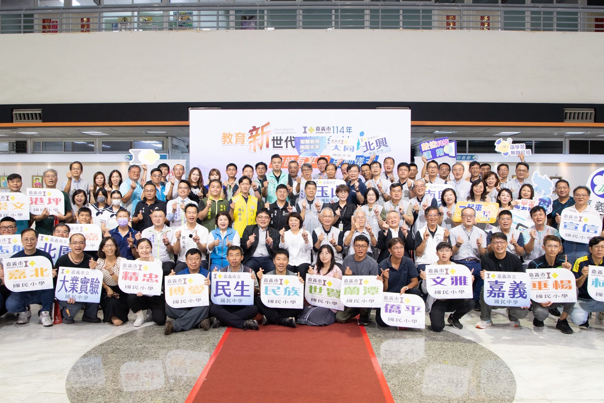 嘉義市長黃敏惠、教育處長郭添財與來賓於市府一樓中庭「師師有平板」啟動儀式共同啟動並合影留念。