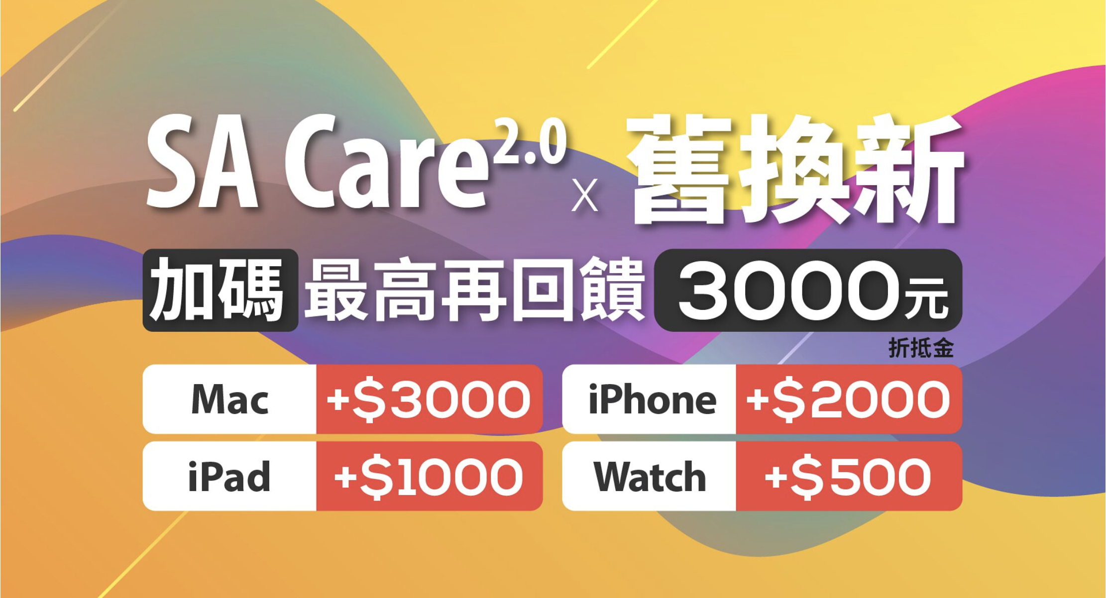 2019.6.1起,凡於 SA通路所購買之主機,同時加購、或於開通 60天內投保「SA Care 2.0 全方位保障計劃」 for Mac 三年期、for iOS 二年期、for Watch 二年期,只要在“保固期間”回來舊換新,除了舊換新折抵金額,加碼最高再回饋 3000元折抵金(門市活動無美安回饋)。