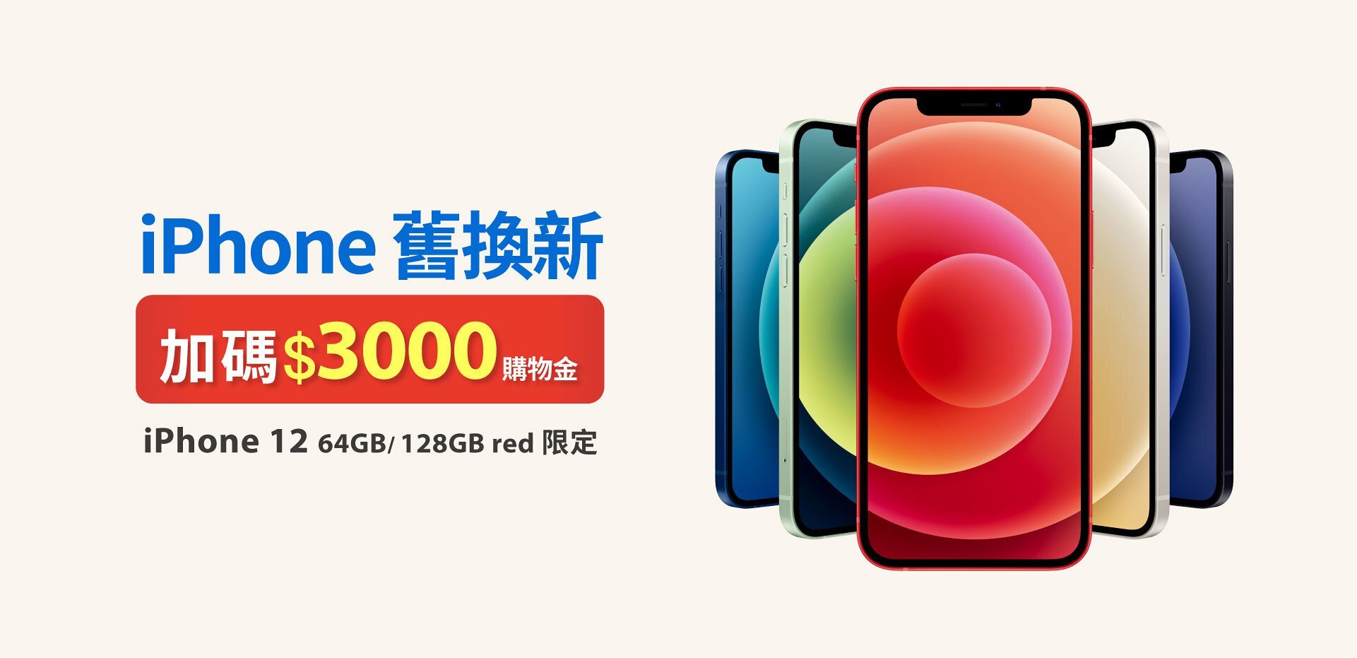 2021.07.12起,凡以舊換新換購 iPhone 12 64GB全系列&128GB 指定機型!除了舊換新折抵金額,加碼再贈購物金1,000元,iPhone 12 64GB型機,單機回饋最高 3,000元!