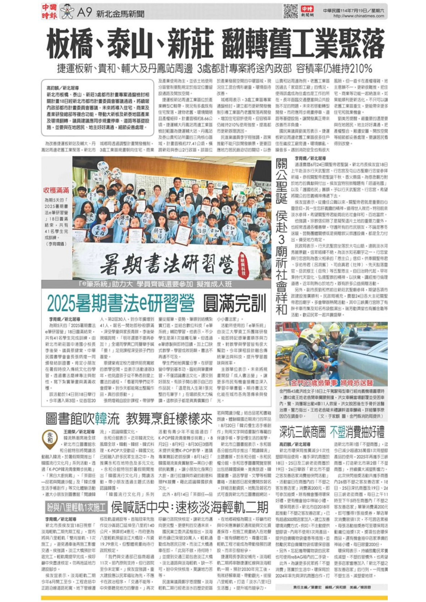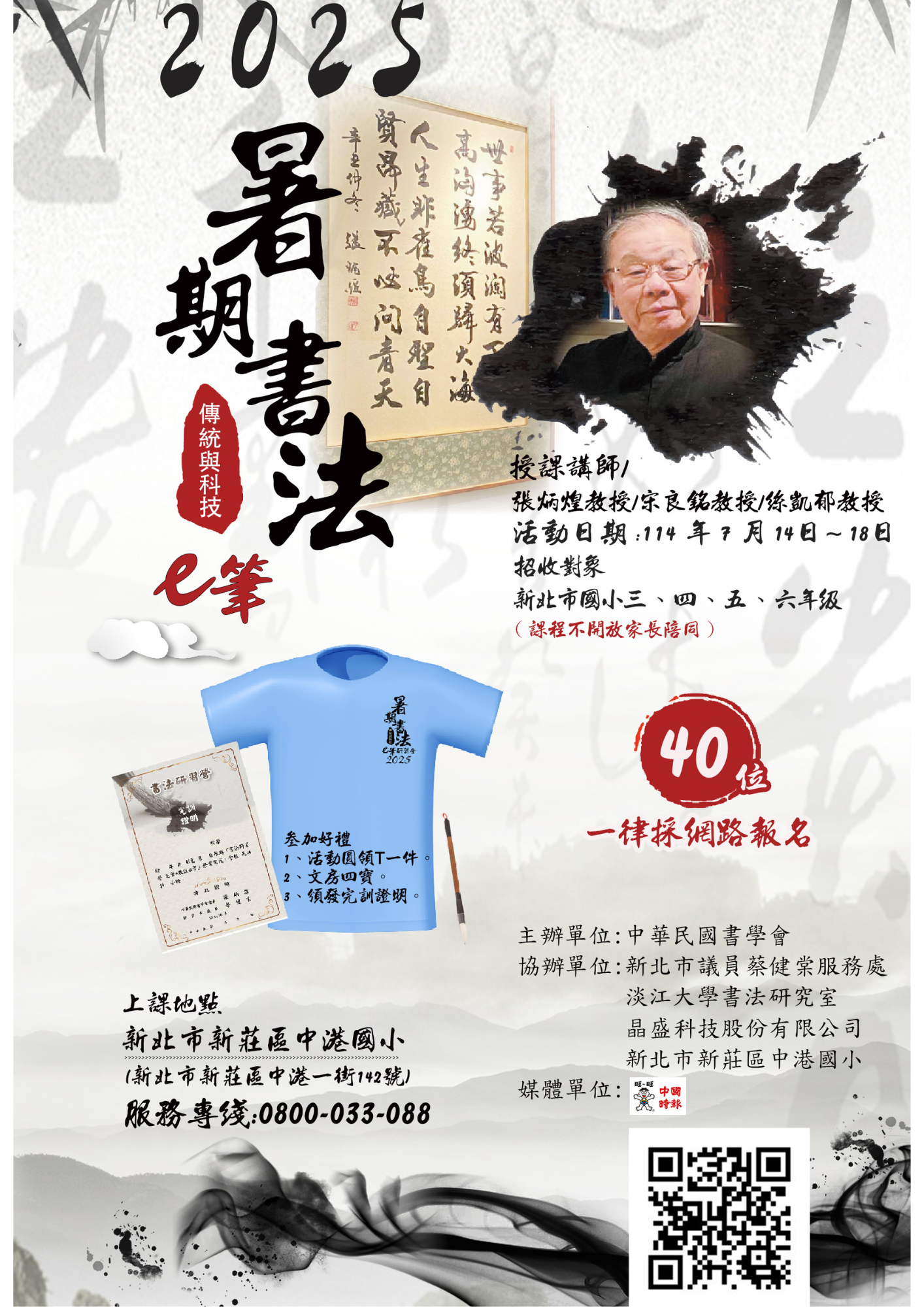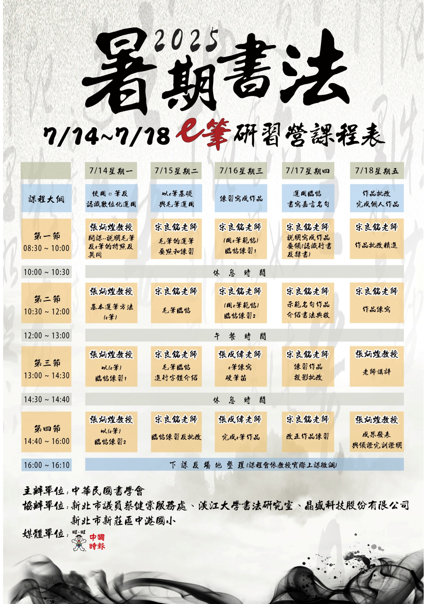 由淡江大學教授張炳煌策畫,在新北市議員蔡健棠徵得新北市文化局之支持,中國時報及晶盛科技公司的協助之下,在三年前設立”暑期兒童書法e筆研習營”,從第一年的20位到去年30位,今年已增至43位。7月14日至18日在新莊市中港國小,整整五天的課程,首創以毛筆和e筆結合的教學。