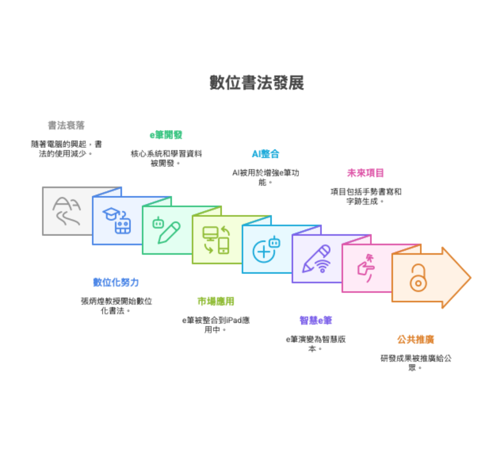 自 2021 年起,由張炳煌教授主導,啟動「e筆 AB 雙軌轉型研發計畫」。A 軌聚焦書寫與繪畫功能強化,B 軌則全面導入 AI 技術,結合資工與人工智慧領域教授洪文斌、陳建彰等人共同推動。透過多年研發,數位 e筆已進化為「智慧 e筆」,結合人工智慧與書藝技法,邁向融合書法與繪畫的現代傳承之路。