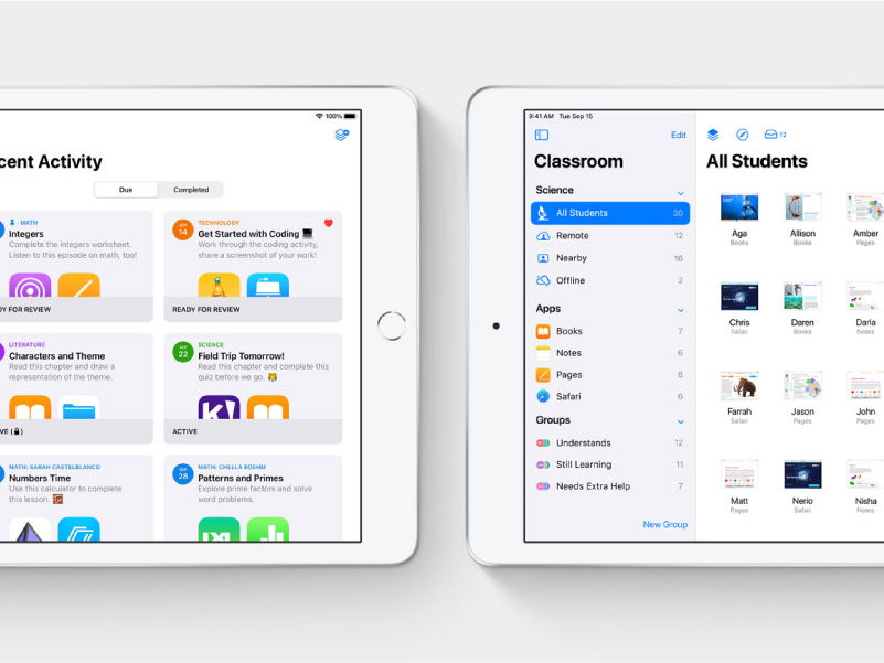 Apple 提供了「Classroom App」課堂管理方式,讓教師不論是實體還是遠距教學都能在上課期間直接鎖定學生 iPad 畫面、管理學生開啟指定App、觀看學生 iPad 使用狀況,讓老師課堂使用更便利。另外「Schoolwork App」提供整合的收發作業功能,教師可於彈指之間派發如 Keynote、 Pages、Numbers 文件作業,還能整合如 Kahoot、 Quizlet 等其他廣受教師歡迎的教學網站工具,直接施測並取得分數。