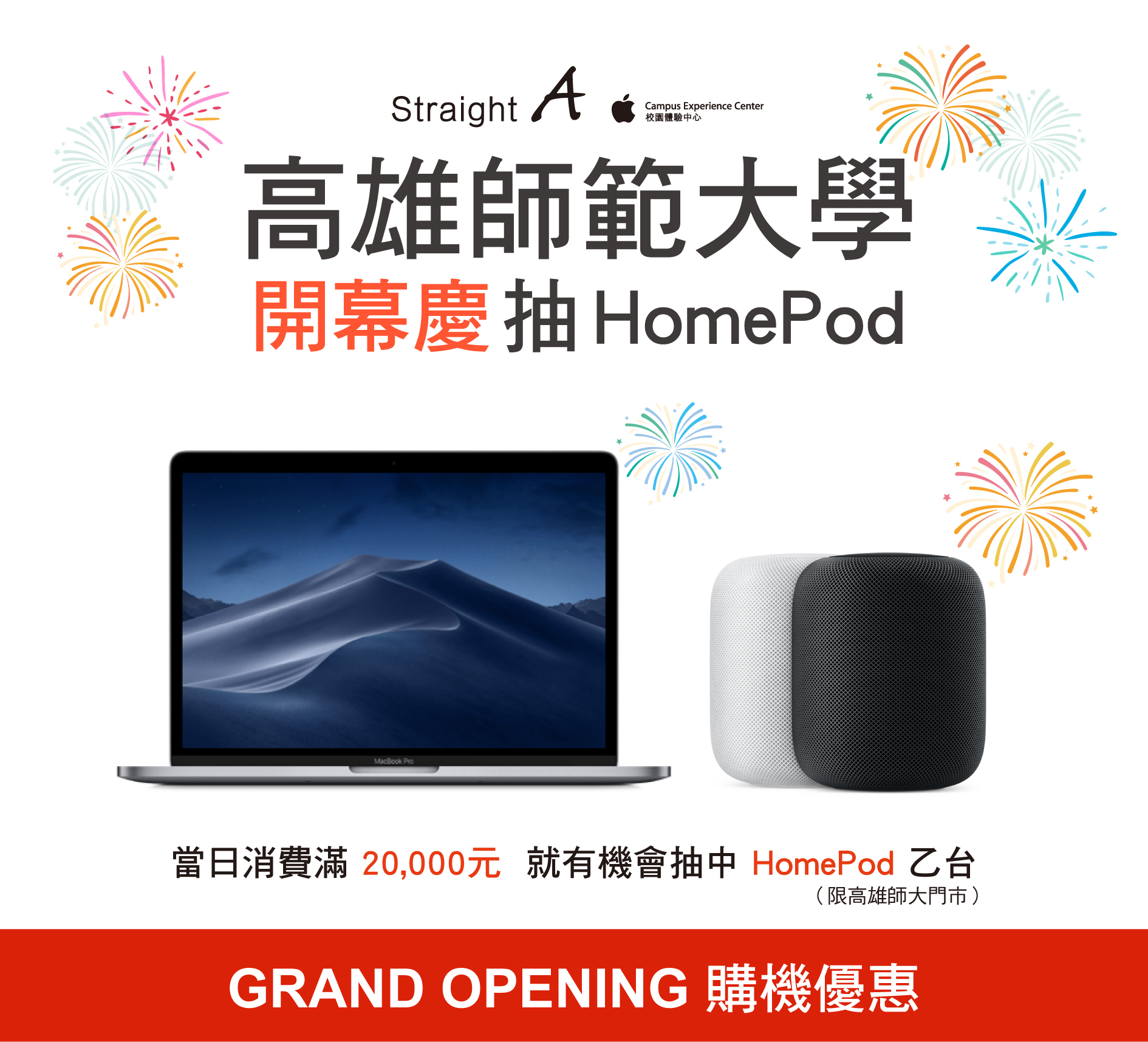 1. 活動日期:即日起 ~ 2019/12/01,歡迎上 Straight A 官網 www.straighta.com.tw 預約,購機時請出示有效之教職員師生證件。2. AirPods 1元方案限定為AirPods有線充電版本 ,且付款方式僅適用一筆付清。3. 本活動適用於 Mac 筆電 2019 年新機種與 iMac 全系列之標配版機型,數量有限,售完為止。3. 本優惠方案需配合於【 Straight A 晶盛科技】粉絲團貼文按讚分享,且標記兩位好友。4. 本優惠活動皆不併行,恕不包含客製機與福利品,活動期間內每人限購1組。5. 贈品皆以門市現貨為準,恕不得挑色、更換、找零及折現,贈品數量有限送完為止。6. Mac 5% 購物金回饋方案,以電腦主機結帳金額計算。7.「購物金」可折抵現場副廠周邊商品,恕不包含 Apple 周邊商品,僅有 iPad 購物金方案,可折抵 Apple Pencil。8. iPad 方案付款方式僅適用現金及信用卡一筆刷清。9. SA Care 2.0 全方位保障計畫須於任一款新機購買當下加購,即享修護契約期限內,本機硬體保固維修不限次且無自負額,意外損害可享有兩次維修服務。(不影響正常使用之外觀損壞,不在維修範圍內) ,詳細內容請洽門市人員。10.【抽HomePod活動辦法】需於2019/10/31在 Straight A 高雄師範大學門市,當日消費滿 2 萬元(含)以上,即可獲1次抽獎機會,符合資格者,須於消費當下,配合門市人員登錄「 Straight A 高雄師範大學開幕慶 抽HomePod」抽獎活動,如登錄資料不實或資訊錯誤,視同自動放棄抽將機會,非當日發票恕不得登錄。【得獎獎項】HomePod 乙台,價值$9,900。將於2019/11/20 前抽出,並於《Straight A晶盛科技》粉絲團公佈,本公司將主動通知得獎者領取。【獎品領取】請得獎者於2019/11/30前,憑存身分證與消費發票至原消費門市完成領獎,須配合繳交身分證件影本並填寫相關領獎證明,得獎者若無法配合,則視為自動棄權,不具得獎資格。逾期未領者將視同放棄,本公司有權將贈品移作他用,恕不接受異議。獎品內容以實物為準,不得折換現金或其他物品,中獎資格亦不得轉讓或出售他人。11. 本公司保有活動期間調整、活動內容變更及最終解釋權