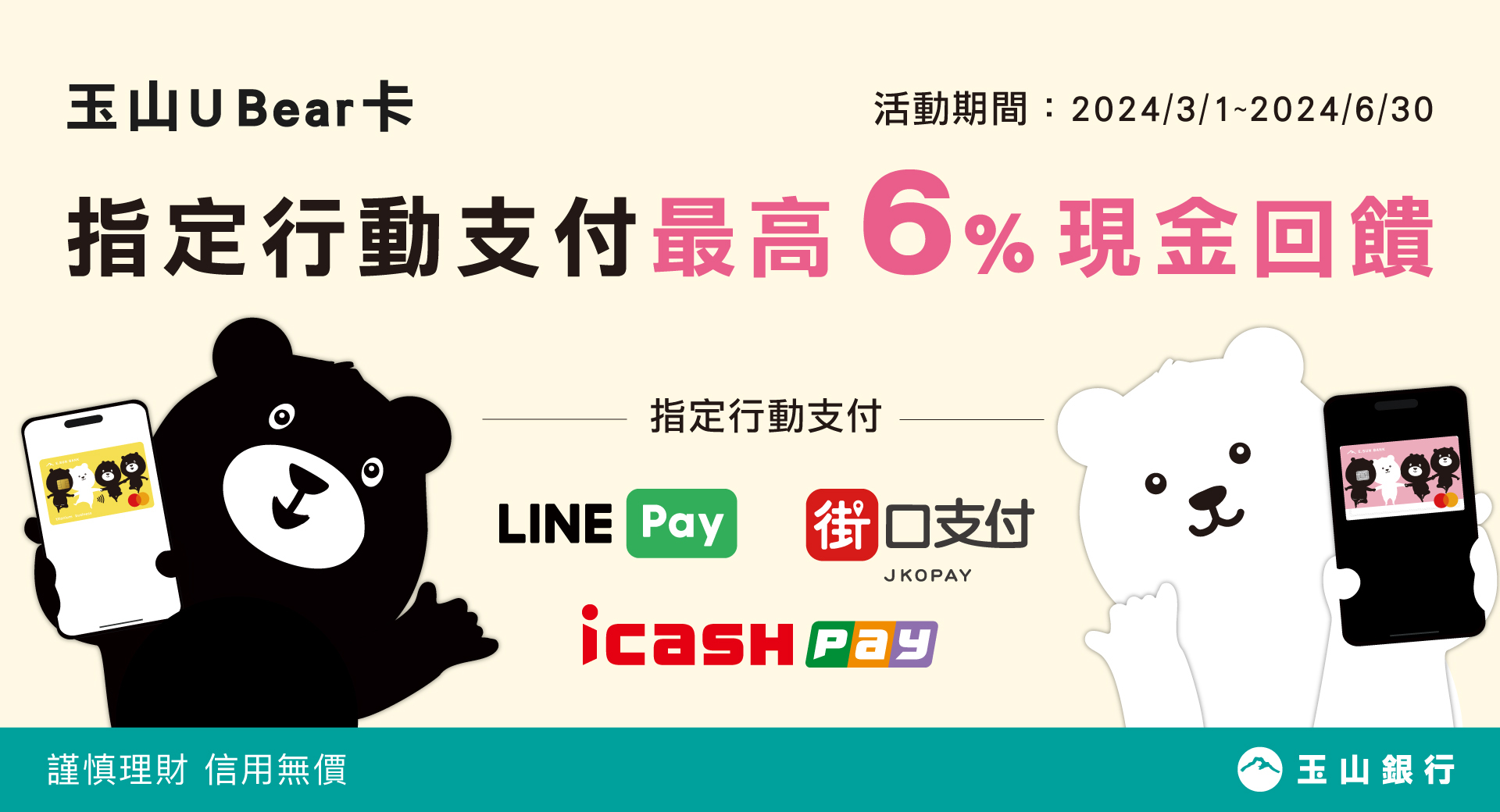 活動二:指定行動支付再加碼3% 回饋,於 2024/6/30 前使用「玉山UBear 卡」於 STUDIO A / Straight A 官網使用LINE Pay、街口支付、icash Pay 刷卡消費,最高享 6%現金回饋。