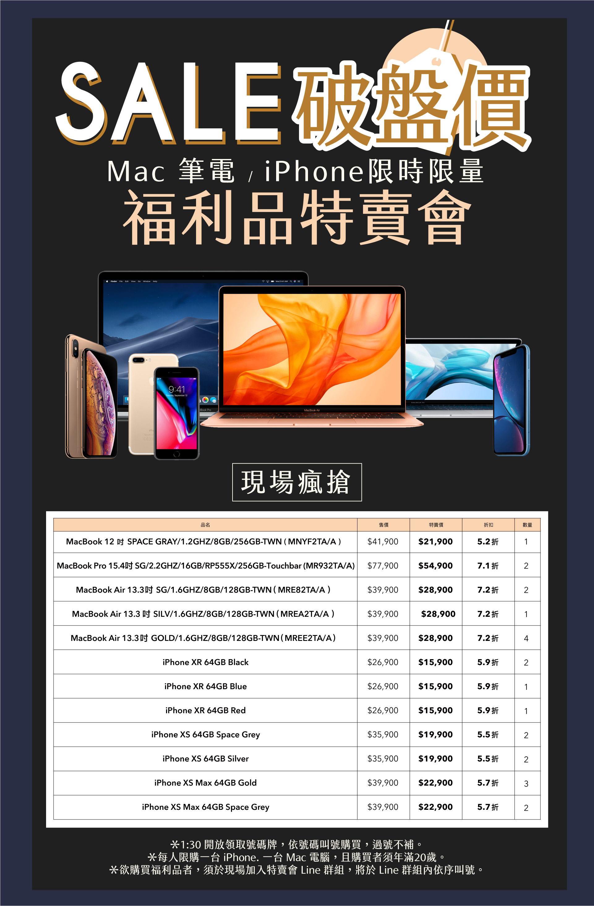 備註:1. 福利品特賣,僅開放於極速領域秋季賽現場限量搶購,售完即止,且每人限購一台 iPhone. 一台 Mac 筆電。2. Mac 購機優惠適用於 Mac 筆電 2019 年新機種之標配版機型,數量有限,售完為止,歡迎即日起 ~ 2019/11/29 至 Straight A 官網 www.straighta.com.tw 預約,須於訂單備註為 [ 極速領域玩家 ],購機時請出示有效之學生證件,於 Straight A 全台各校園門市取貨。3. AirPods 1 元方案限定為 AirPods 有線充電版本。4. 「購物金」可至門市折抵現場副廠周邊商品。5. 贈品皆以門市現貨為準,恕不得更換、找零及折現,贈品數量有限送完為止。6. 活動期間內凡於 Straight A 購買任一款 iPhone、iPad、iPad Pro、Mac 電腦全新主機(福利品除外),即可獲得「桃園-首爾,團體來回雙人機票」,數量有限送完為止,機票兌換方式及使用相關規定請參閱 SA 官網公告 https://lihi1.com/LPqAm 7. 贈品 KKBOX 90天學生方案僅適用 Mac 筆電 2019 年新機種之標配版機型,恕不包含福利機,且於門市取機時一併領取。8. 本公司保有活動期間調整、活動內容變更及最終解釋權。