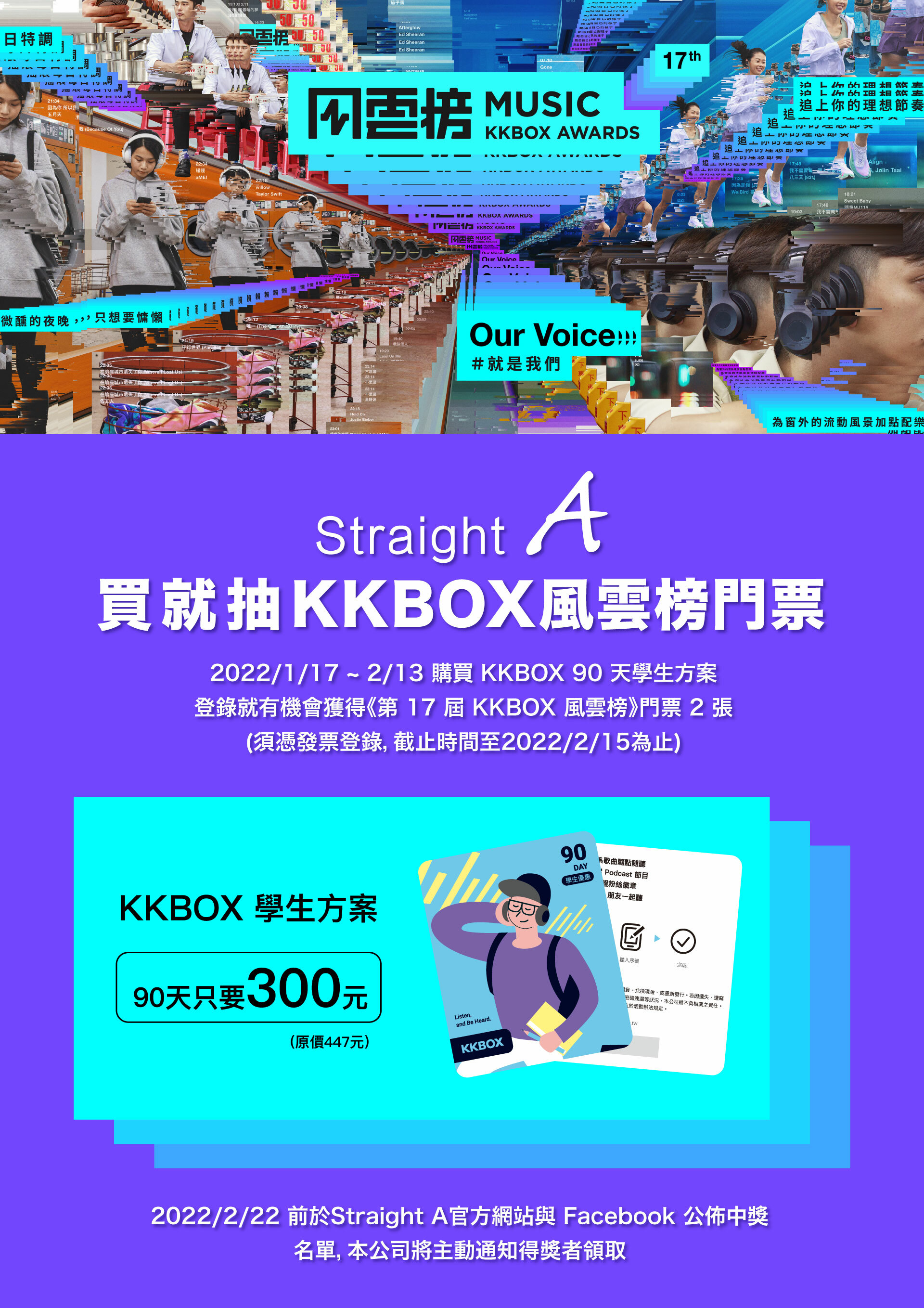 3. 得獎獎項:2022/2/26 (六) 台北流行音樂中心《第 17 屆 KKBOX 風雲榜》門票 2 張,限量 1 位。